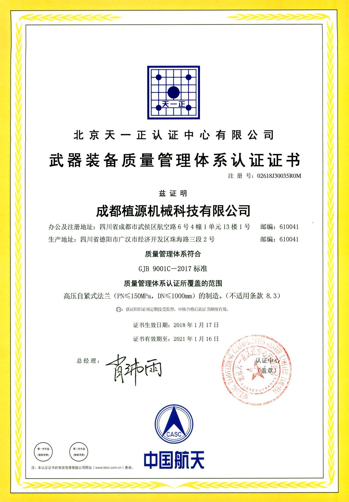 2017年11月,“成都植源”公司迎來(lái)北京天一正認證中心有限公司的資深審核員錢(qián)紅、韓豫川,對公司進(jìn)行國軍標GJB9001C-2017的質(zhì)量管理體系認證審核。
